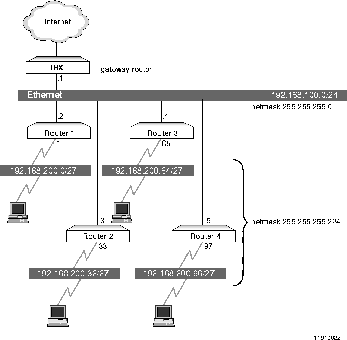 Figure 2-1 illustrates an appropriate implementation of subnetting. The example uses two class C addresses, one (192.168.100.0) for the local Ethernet segment and one (192.168.200.0) for dial-in users.