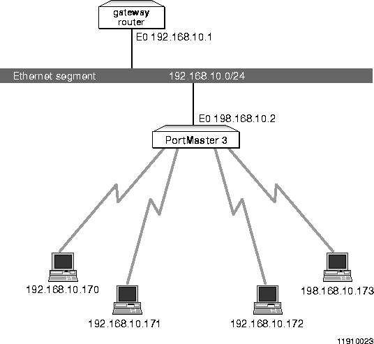 Proxy Address Resolution Protocol (ARP) is ARP for an IP address that is not local on the LAN. Figure 2-2 shows an example in which the PortMaster 3 Integrated Access Server acts as the proxy for dial-in users. The IP address of dial-in users must be in the same range as the Ethernet segment.